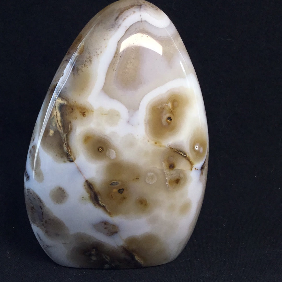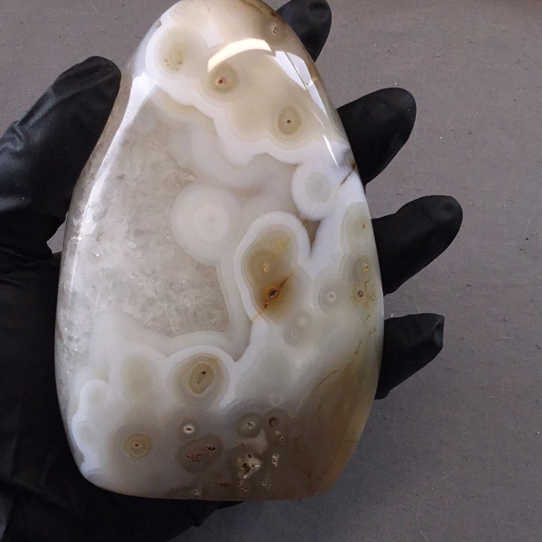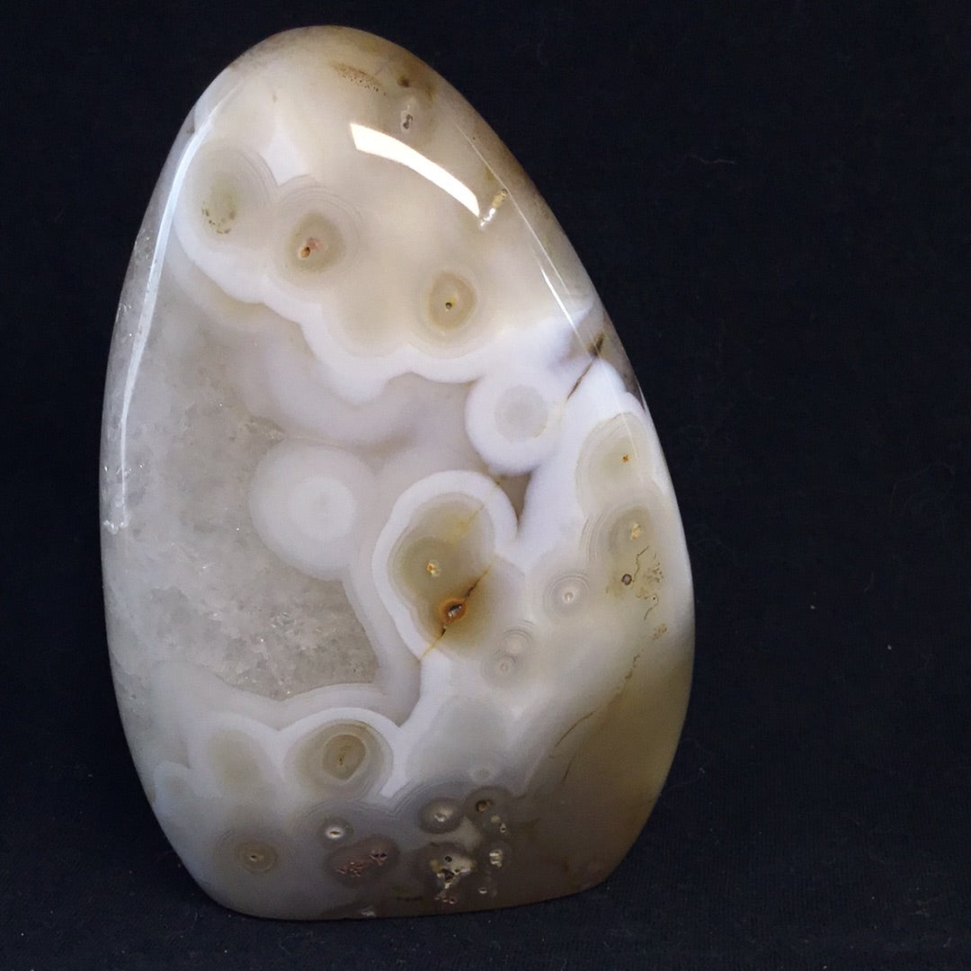Agate is the name given to numerous varieties of banded Chalcedony, a mineral of the Quartz family. Its name comes from the Achetes River in Sicily, where Agates were first found. Usually banded in layers, or stripes, some varieties have “eye” markings, or specks of color, some have fossilized inclusions, and others are solid. Called the earth rainbow, the concentric bands of Agate form in nearly every color the earth can produce, including a colorless form.Historically, Agate has been discovered with the artifacts of Neolithic people, and was used as healing amulets and ornamentation dating back to Babylon