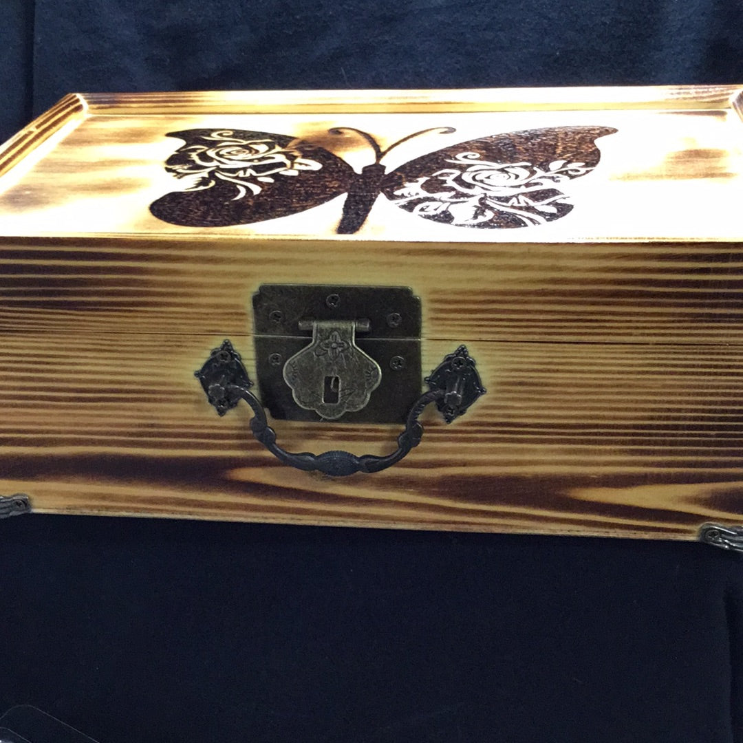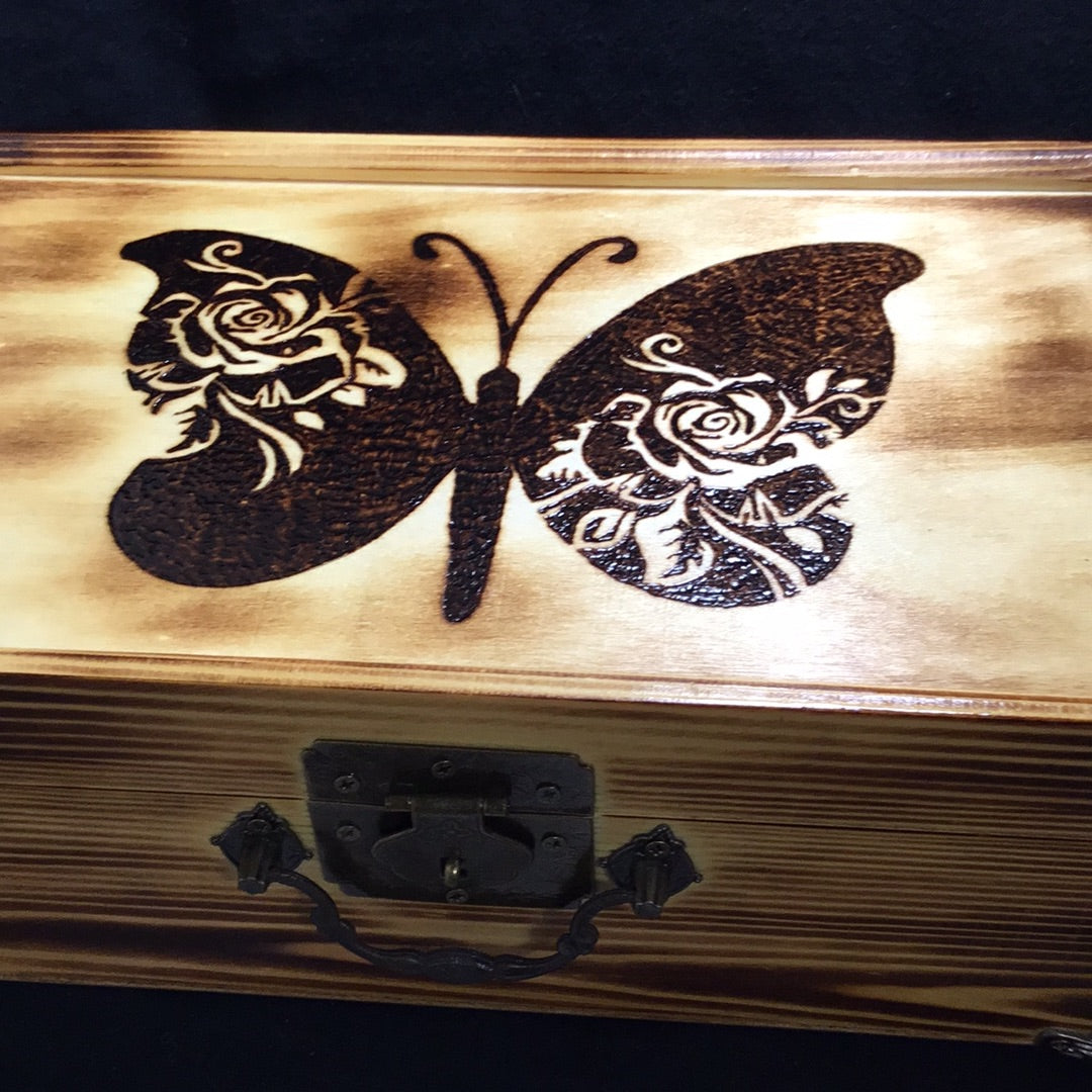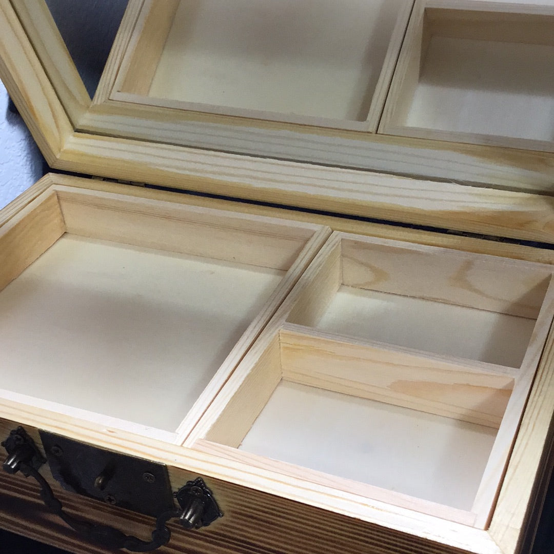 Box is hand burned and coated with polyurethane. Has a mirror and organizer that are removable