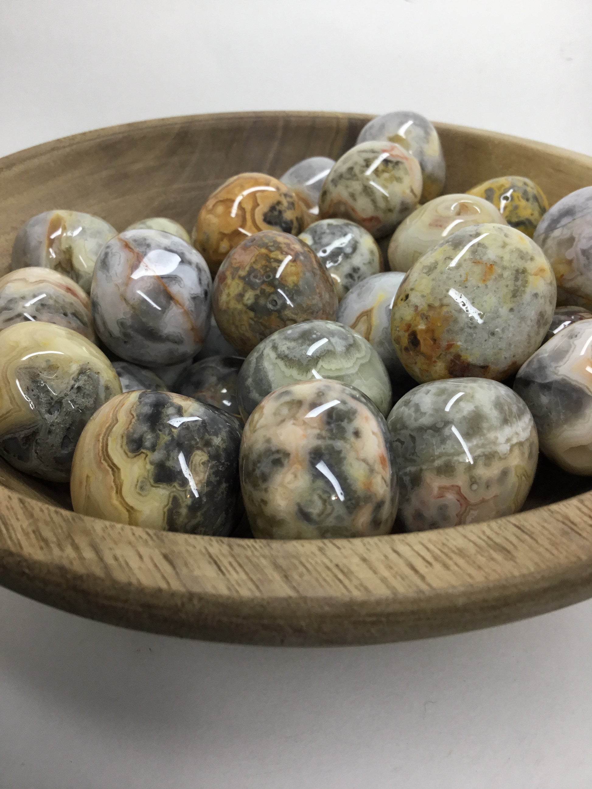 Crazy Lace Agate is a variety of banded Chalcedony, a mineral of the Quartz family. It is predominantly white, with layers of creamy browns, blacks and grays. Some may include layers of yellow ochre, gold, scarlet and red. Agate is sometimes called the earth rainbow because, in its various forms, the concentric bands in nature form nearly every color the earth can produce, including a colorless form.