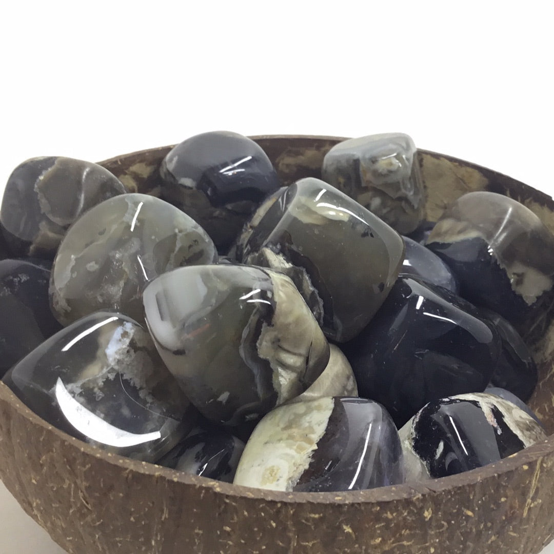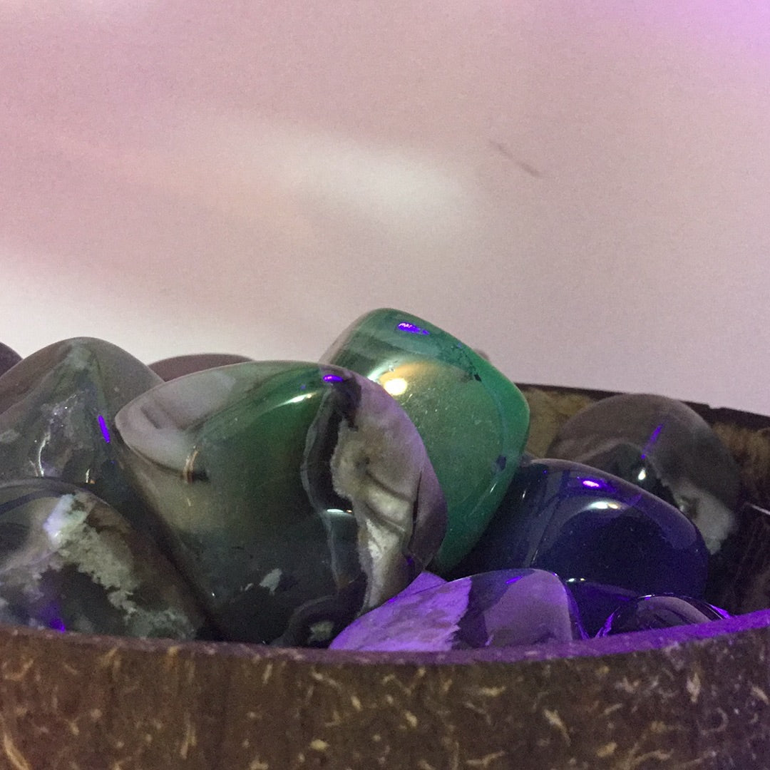 This fairly new material has been named "Volcano Agate," a captivating stone with a fiery secret. Made from a unique UV-reactive agate, this sphere shows an earthy appearance in daylight. However, under a longwave UV light, this agate glows with an intense, bright green luminescence