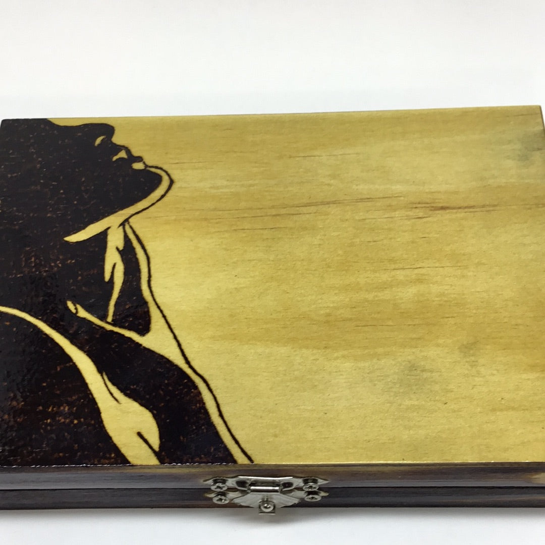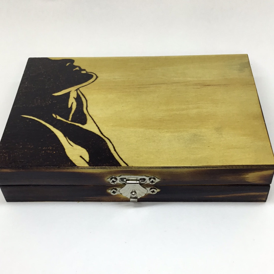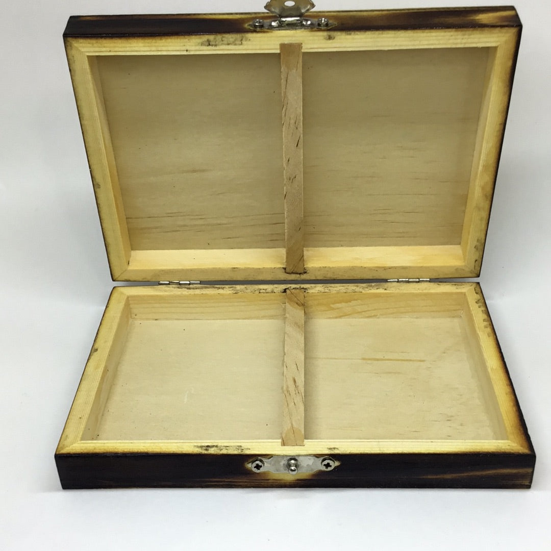 Box is hand burned and coated with polyurethane. This box is great to hold a deck of cards or business cards